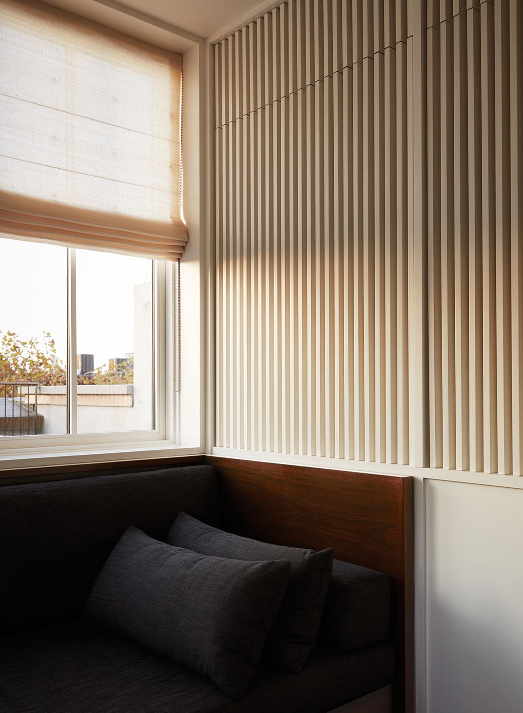 A custom light fixture above the breakfast banquette and a new view corridor from the front parlor to the garden bring natural light deep into the home. Above, a recessed penthouse with a terrace offers a private retreat while preserving the historic cornice line.